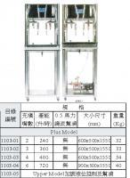 本機具有特別設計之快速充填頭,且藉由改變橡膠墊圈位置即可控制充填高度,每瓶充填至同一高度即自動關閉,並根據瓶子大小(0.5-2.0公升)變換充填容量。除了堅固耐用及配置電子式浮球防止溢流外,底部具滑輪移動方便,且可12嘴同時充填,速度更快。