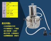 本製酒機為雙層夾套式蒸餾設備,內外皆可利用蒸氣加熱,並配合表面積超大之管式熱交換器進行冷卻,出酒速率超快。每分鐘達 2-4 公升。除本體外,另附接酒桶一個,適用於各種酒類之快速蒸餾。